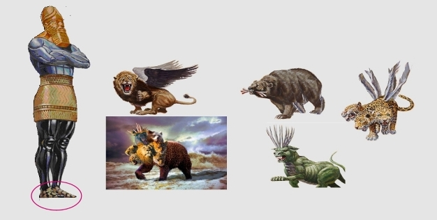 Даниил 7:2 «Я, Даниял, видел в моём ночном видении, как четыре небесных ветра волновали великое море. 3 И четыре великих зверя, каждый из которых отличался от прочих, вышли из моря. 4 Первый был точно лев и имел орлиные крылья. Я глядел, пока не были вырваны его крылья, и, поднятый над землёй, он встал на две ноги, как человек, и дано ему было сердце человеческое. 5 Затем вышел второй зверь, подобный медведю. Он поднялся на задние лапы, и во рту между зубами у него было три клыка. Ему было сказано: „Встань, наешься досыта мяса!“ 6 После этого я посмотрел, и явился иной зверь, подобный барсу. На спине у него было четыре крыла, словно птичьи. Зверь этот был четырёхглавый, и дана ему была власть править. 7 После этого видел я в ночных видениях четвёртого зверя – жуткого, ужасного и очень сильного. У него были огромные железные зубы; он крушил и пожирал свои жертвы и остатки попирал ногами. Он не был похож на всех предыдущих зверей, и было у него десять рогов.